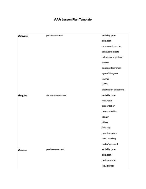 Below is the AAA Lesson Plan Template. There are three columns: activities, assessment, and activity type. I keep this template taped up like poster so when I decide to create a lesson plan I can pick and choose the activity types from each section. Please note that the activity types may increase or change as see fit.