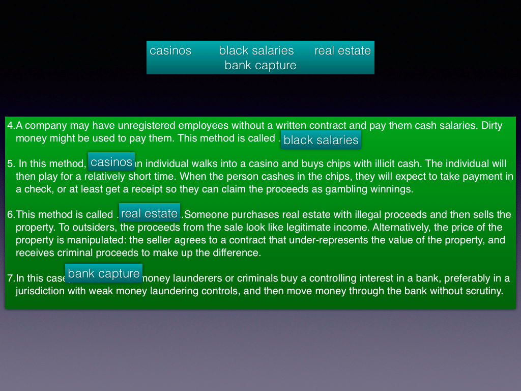 The sample slide below covers a lot of information. A common way to keep students engaged is to have them fill in the blanks with the words from a box. The learners would figure out which words to use by using clues from the sentences around the blank. this controlled exercise is very common in textbooks.