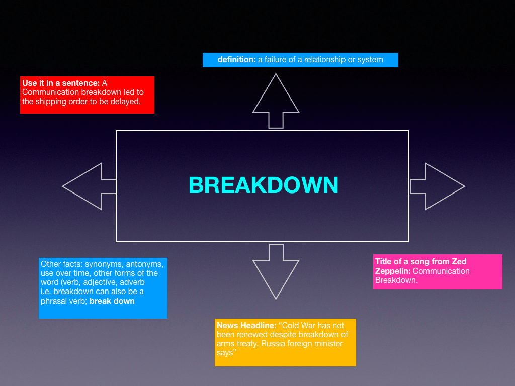 I display this slide and go through the process of developing the example. I start with the definition and then place the other facts around the arrows. The learners are allowed to use their smart phones for gathering information about the term.