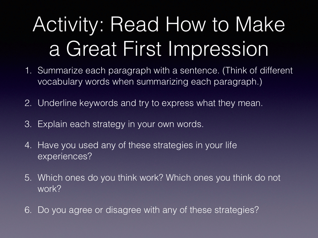 The slide below, gives the instructions needed to complete the jigsaw. Rather than read the article in class, the learners are divided into groups to give a presentation on the section they are assigned. This allows me to watch and observe them by walking around and seeing how they will collaborate with each other.