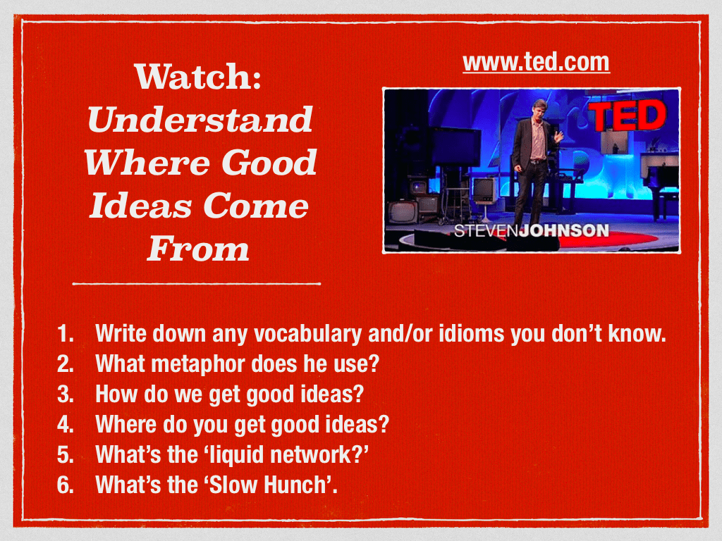 In an earlier posting, I utilize the K-W-L method when showing videos. Sometimes I prefer to layout specific questions for learners to follow or think about before screening the movie. For example, a TedTalk is a good way to get leaners thinking about the movie.