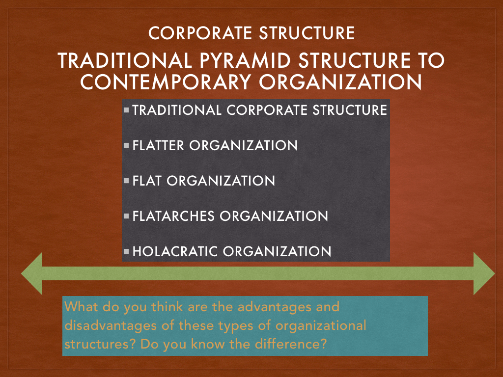 This article uses a flow chart when describing the corporate structure. When a group presents, they can use that visual aid to compliment their presentation.