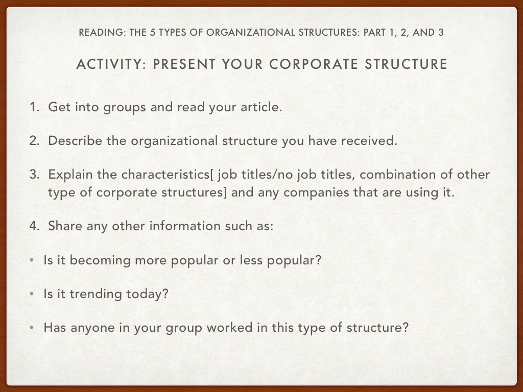 In my Corporate Structure lesson plan, I have the class jigsaw the article, “The 5 types of organizational structures: Part 1, 2, and 3” from Forbes magazine.